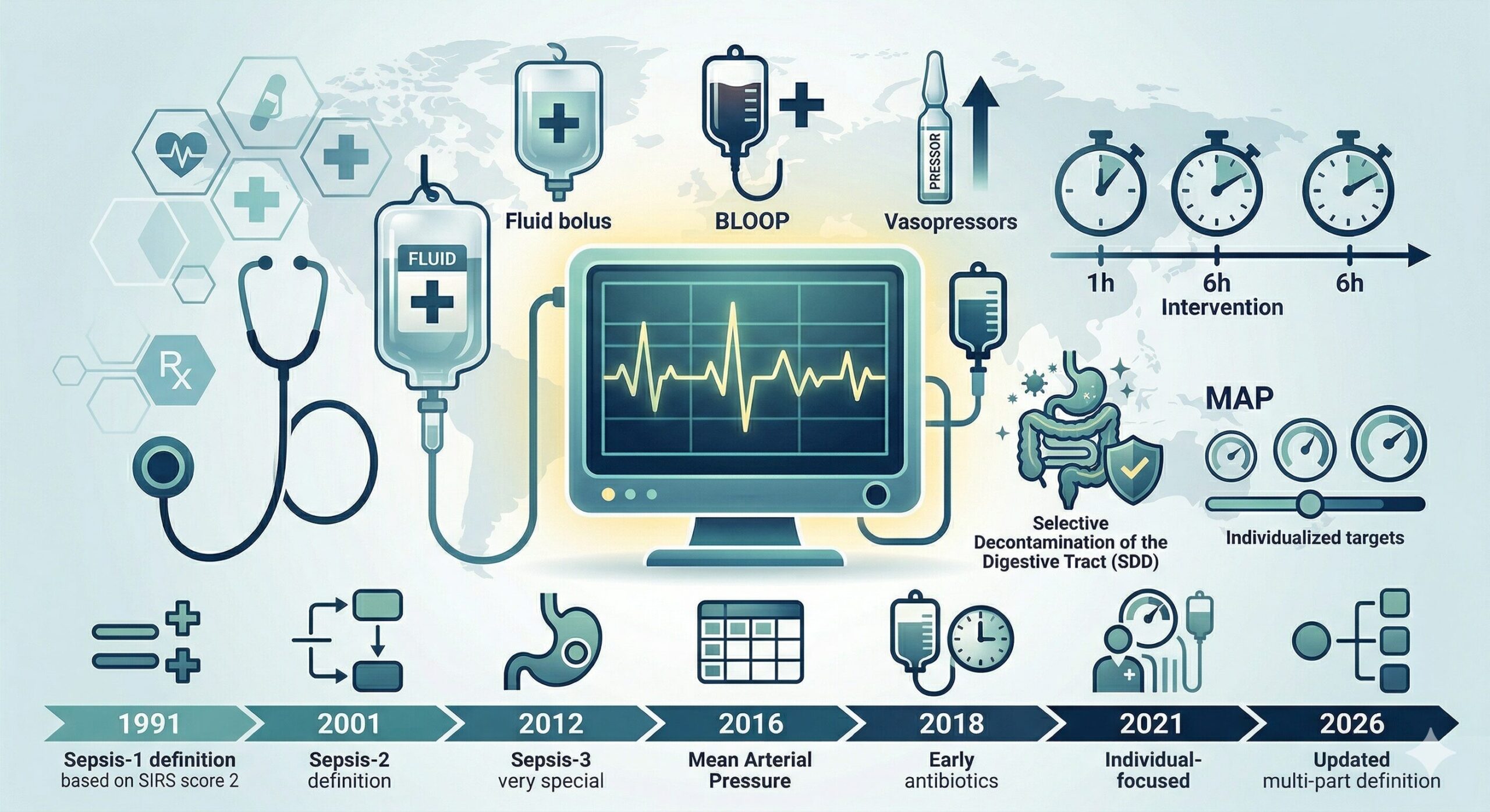 HOUR-1バンドルとして、1時間以内の培養や輸液負荷、広域抗菌薬投与が推奨された。