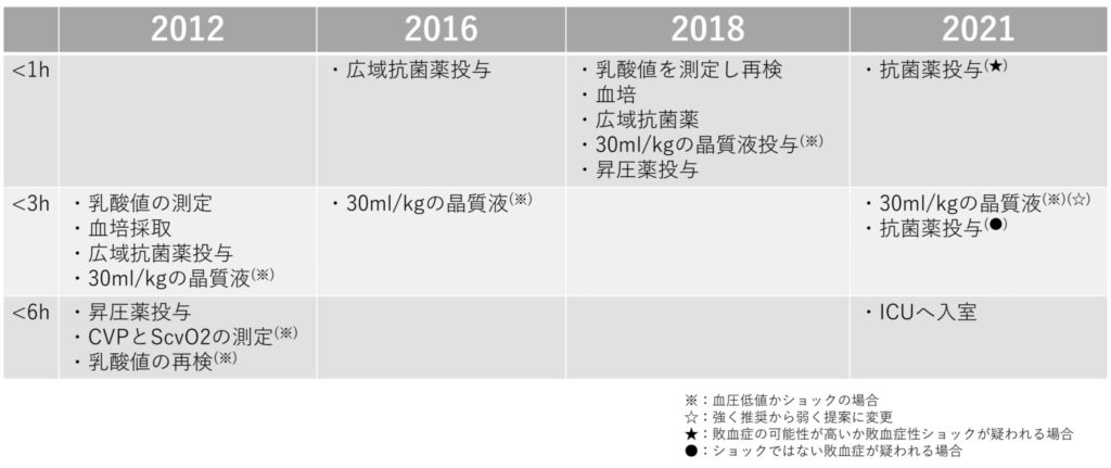 また早期の末梢静脈路からの血管作動薬の使用や6時間以内の早期ICU入室といった記載が追加された。
